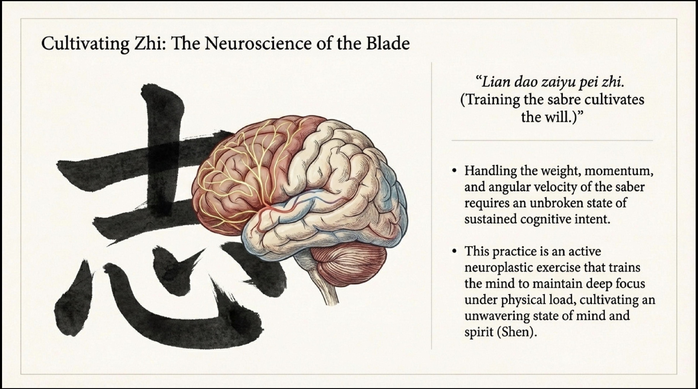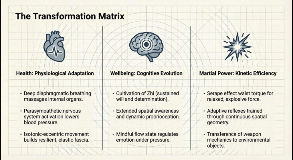 Engaging in the flowing sequences of the Sabre is a strategic exercise in neuroplasticity. This “meditative movement” reduces cortisol and fosters “alpha wave” synchronicity, shifting the brain into a state of focused calm. For the high-pressure professional, this training enhances “Attention Control” and the processing of “Interoceptive Signals,” effectively anchoring the mind in the present. This isn’t just relaxation; it is a refinement of the nervous system.