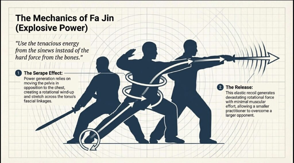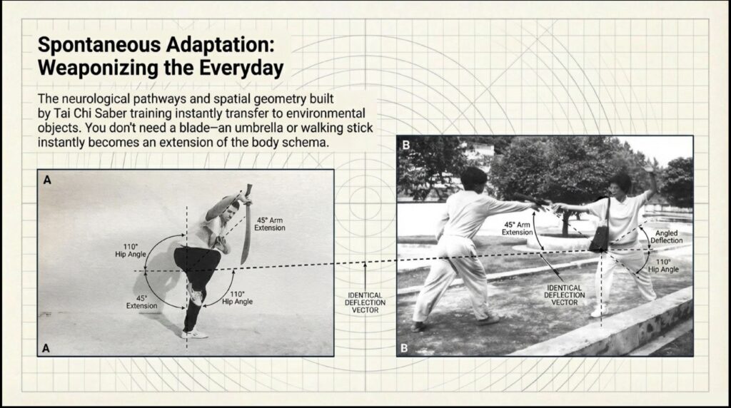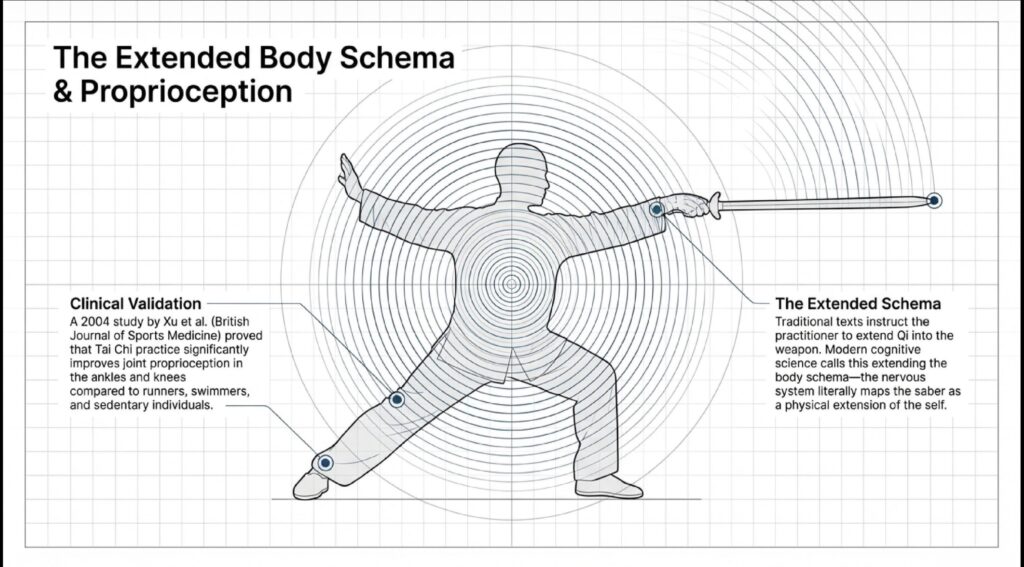 By moving the weighted sabre fluidly and with minimal tension, the practitioner “switches off the brakes”—the antagonistic muscles—through relaxation and intent. This maximizes “neural excitation,” allowing the body to produce force as a single, coordinated unit.