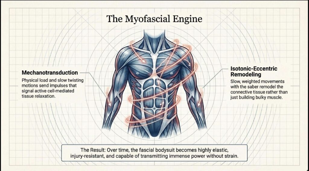 The mechanical stress of maneuvering the Sabre stimulates fibroblasts, the cells responsible for collagen production. Through “mechanotransduction,” the body responds to the Sabre’s weight by remodeling the connective tissue into a more youthful, elastic arrangement. The spirals and circles inherent in Sabre training are not aesthetic choices; they are geometric requirements that engage the longest possible myofascial chains.
